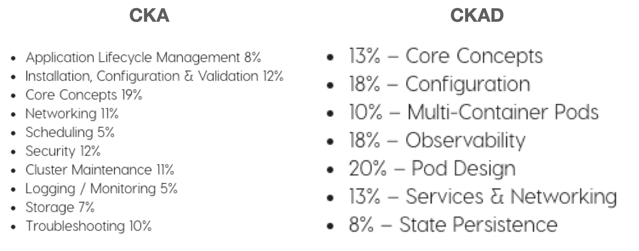 CKAD는 사용자가 쿠버네티스를 활용해서 클라우드 네이티브 어플리케이션을 제대로 디자인하고, 운영하고, 트러블 슈팅할 수 있는지를 평가합니다. 평가하는 영역을 CKA와 비교하면 아래와 같습니다.