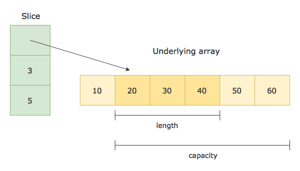 slice란 배열과 같지만 길이가 고정되어 있지 않고 동적으로 크기가 늘어납니다. 또한 배열과 달리 레퍼런스 타입입니다. 이는 내부적으로는 배열을 통해서 값을 관리하며, slice 자체는 배열의 가장 첫번째 요소를 가리키는 포인터를 담게 됩니다.