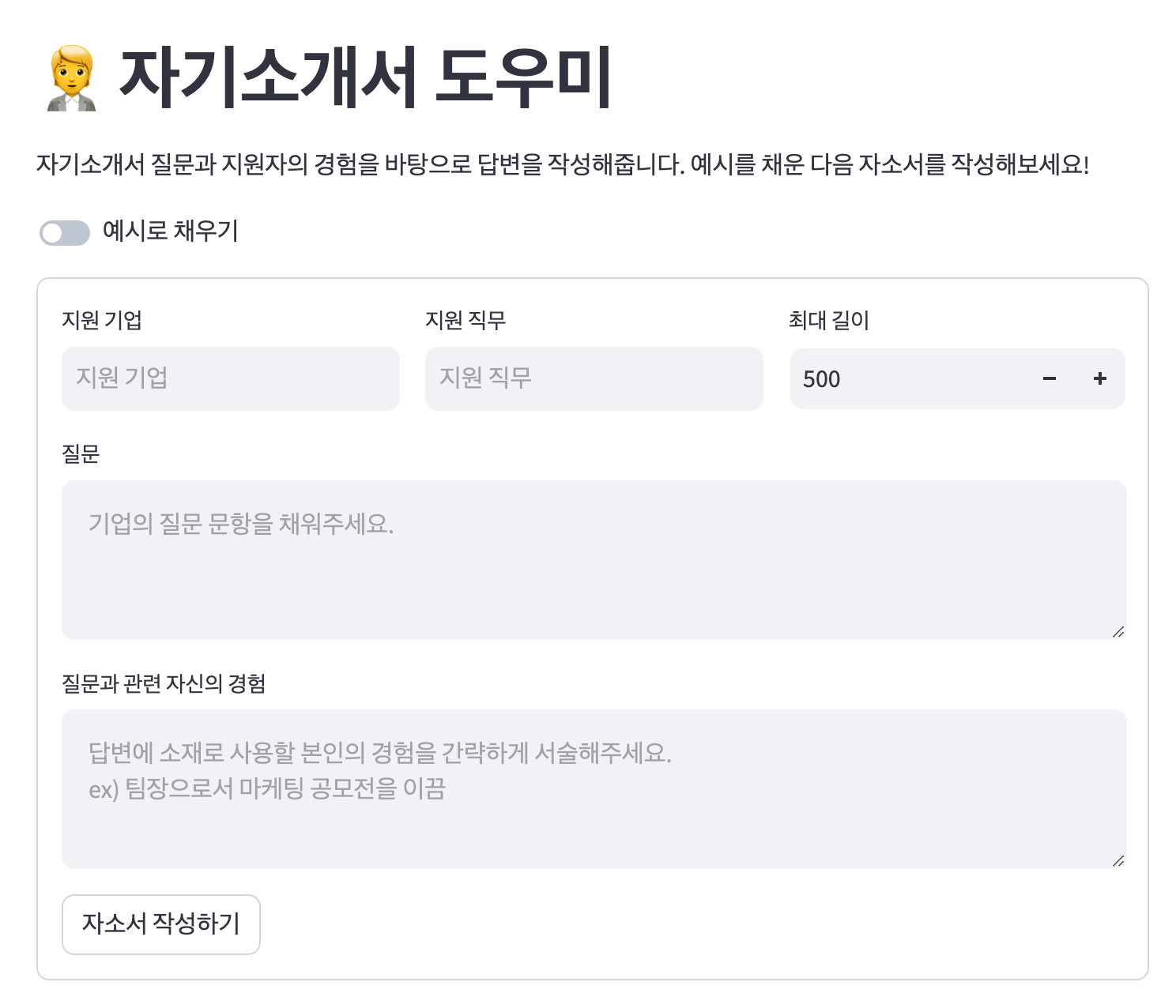 다음은 취준생들을 위한 자소서 자동완성기입니다. 지원하는 기업과 직무, 자소서 문항과 이에 관련된 자신의 경험을 입력하면 chatGPT가 완성도 높은 자소서를 써줍니다. 이를 통해서 개인 맞춤형 텍스트를 생성해주는 방법을 배우게 됩니다.
