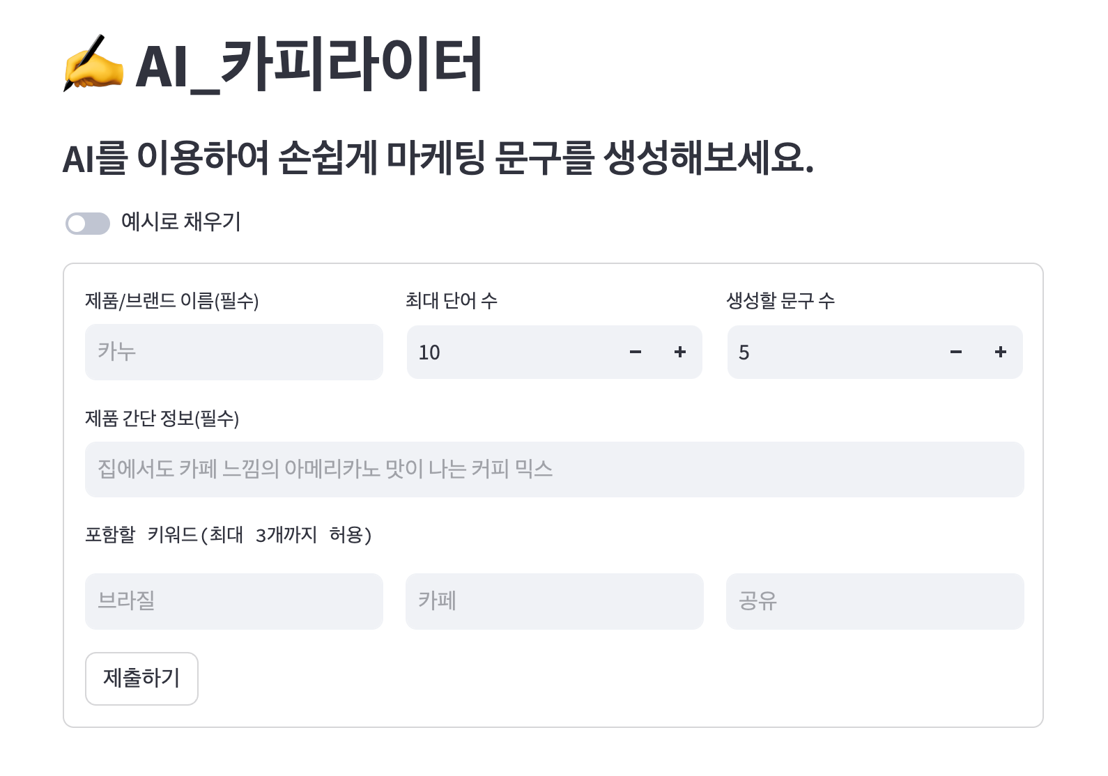이 프로젝트를 직접 만들어보면서 프롬프트 엔지니어링의 기초를 다져봅니다. 그리고 streamlit으로 웹 UI를 만들고, 유저의 입력을 바탕으로 텍스트를 생성한 뒤, 결과를 화면에 출력하는 방법을 배워봅니다.