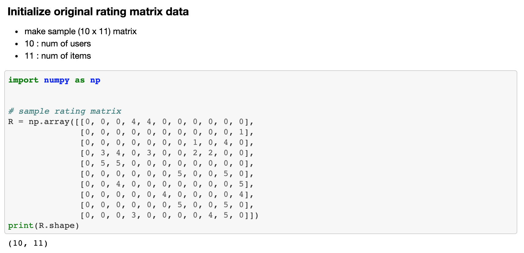 여기서는 임의의 10 x 11평점 행렬을 numpy 라이브러리를 통해서 생성합니다.