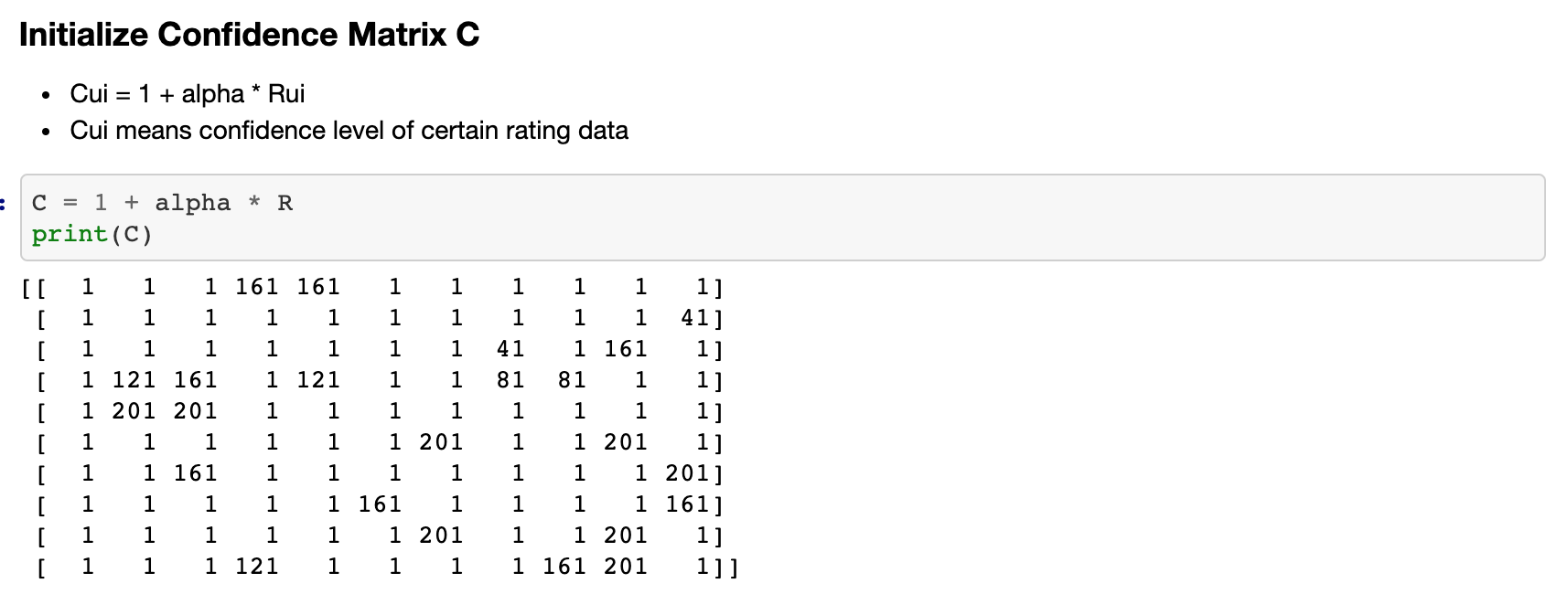 다음으로 주어진 학습용 평점 테이블에 Confidence level을 적용한 C 행렬을 구합니다.