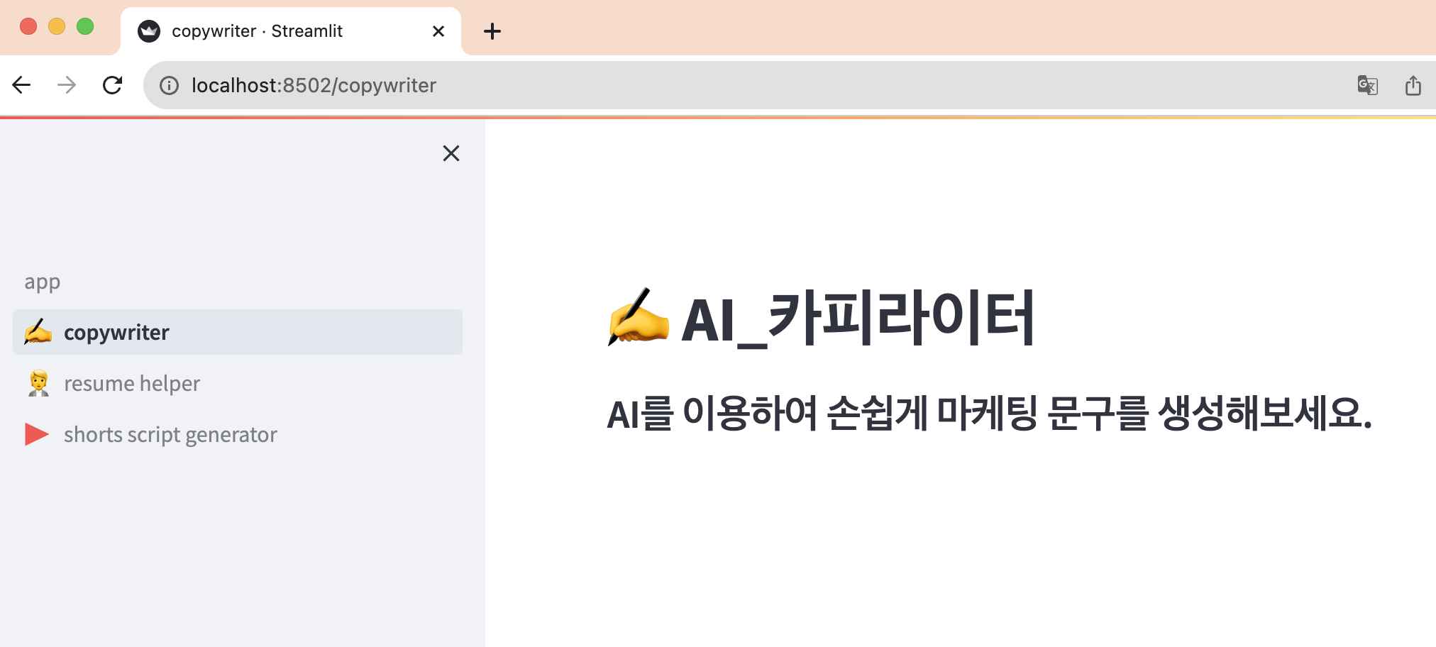 pgaes/1_copywriter.py에 본격적으로 작업을 해보겠습니다. 먼저 title과 subheader로 페이지 소개를 적어주겠습니다.
