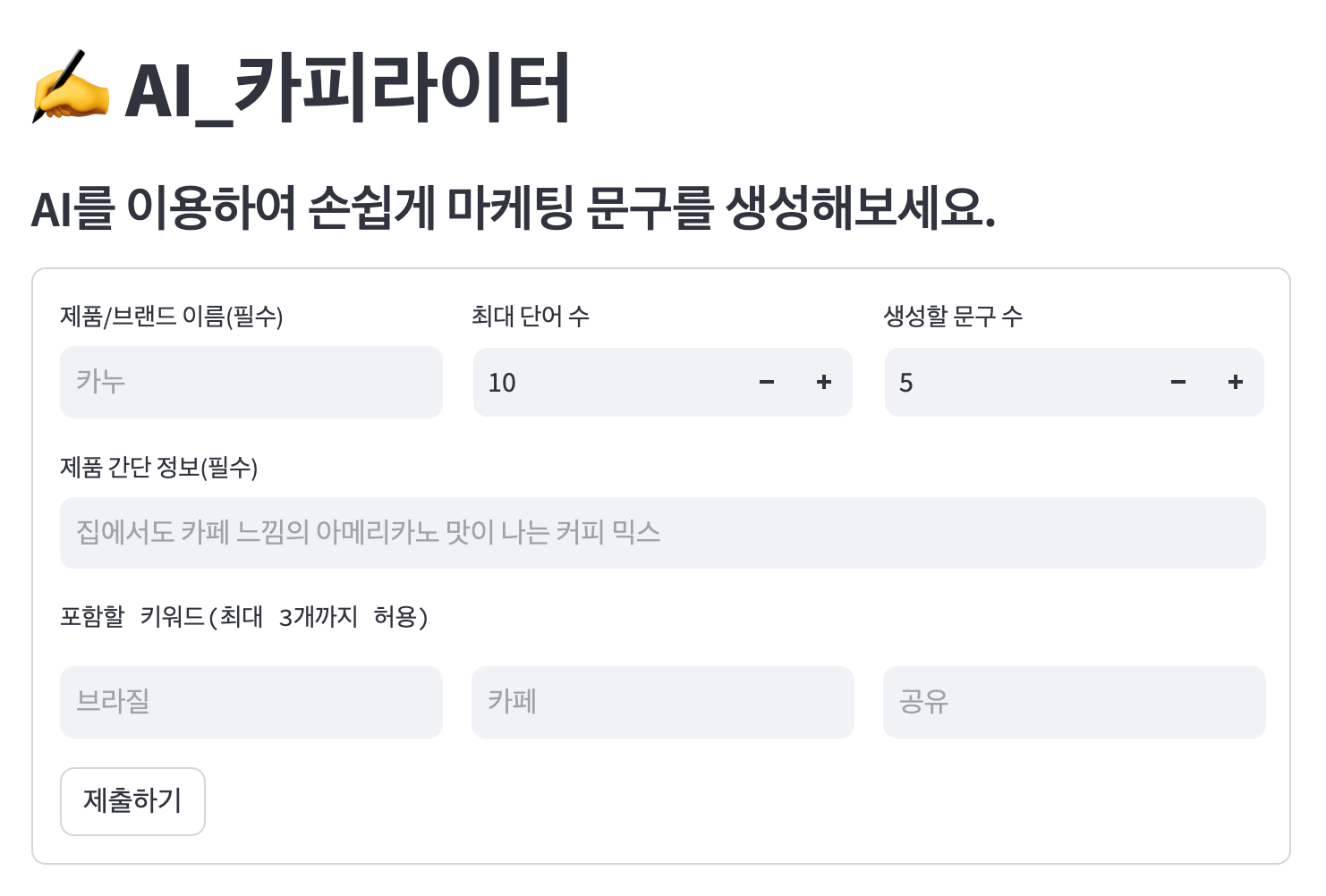 이번 챕터에서는 streamlit을 이용해서 마케팅 문구 생성기 UI를 개발해보겠습니다.