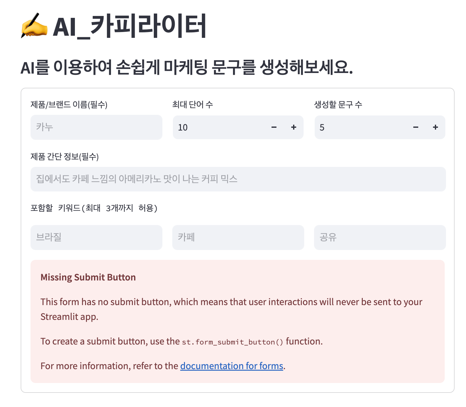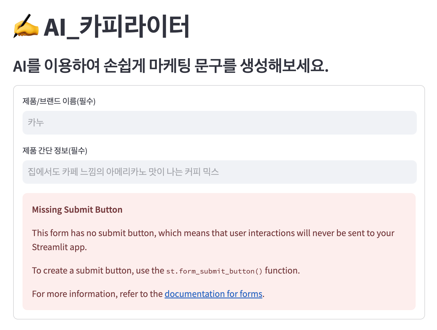 그 다음 프롬프트를 생성하기 위해 필요한 파라미터를 입력받는 폼을 추가합니다. 먼저 제품명과 제품 설명을 입력받을 input을 추가합니다. submit 버튼을 아직 추가하지 않았기 때문에 에러가 나는 것은 당연합니다.