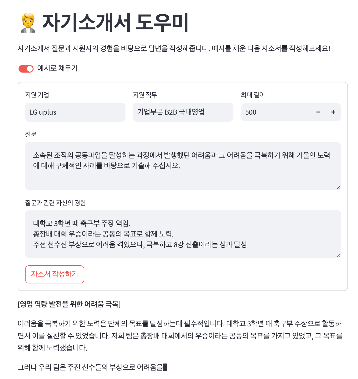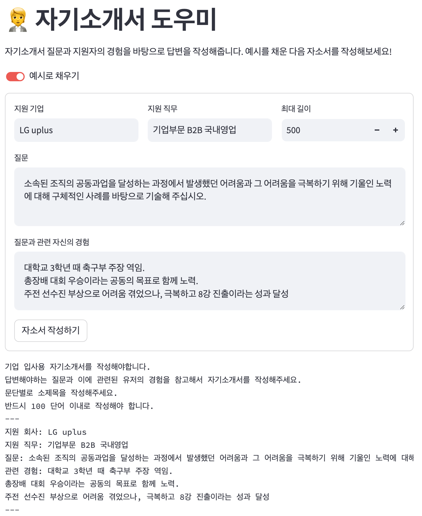 여기까지 자기소개서 도우미 프로젝트를 구현해보았습니다. 생성 AI이기 때문에, 실행할 때마다 결과가 살짝씩 다릅니다. 마음에 드는 결과가 나올 때까지 여러번 시도해보고, 선택하는 것이 좋습니다. 이전에 배웠던 카피라이터 프로젝트와 대동소이 했습니다.